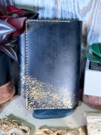 Hand made notebook holder for field notes sized note books. The right pocket holds the notebook and the left side has a pocket that can hold cash or receipts as well as two card slots for credit cards or business cards. A pen can be clipped to the snap over as well. Black with gold splatter.