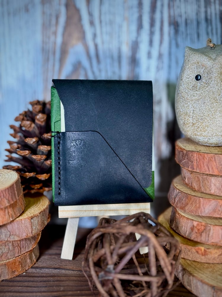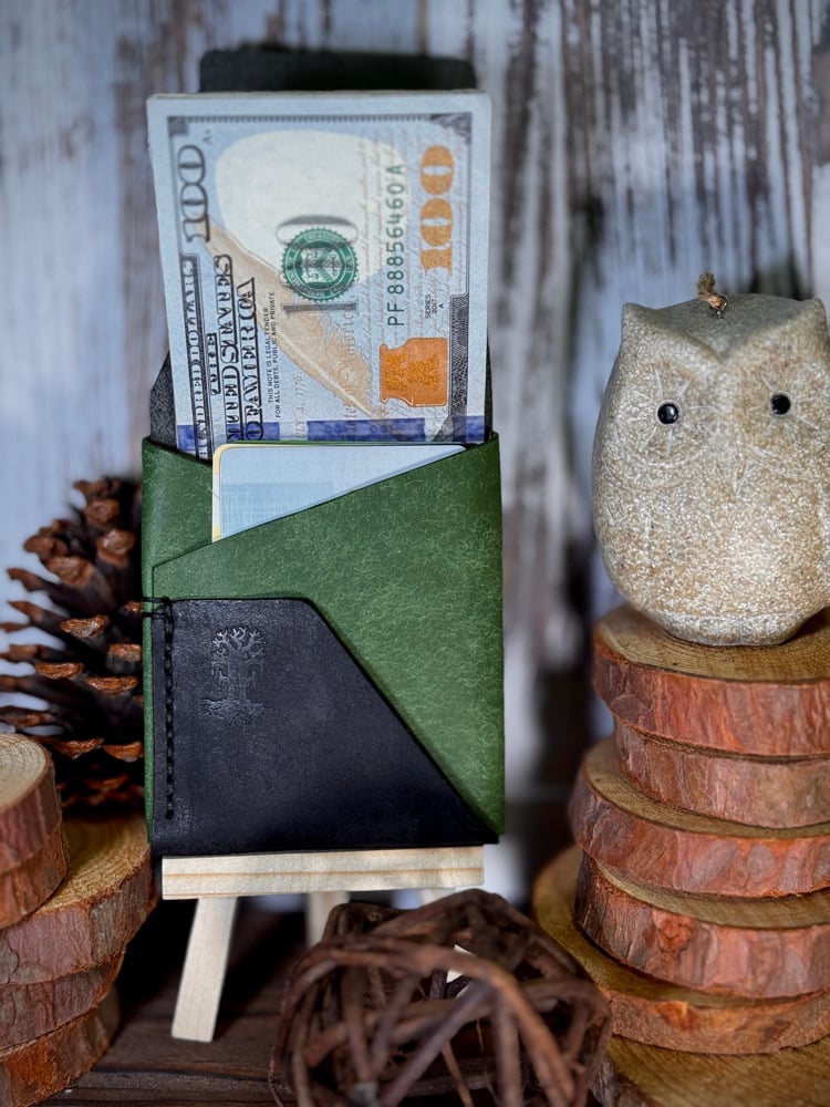 Made from Badalassi Carlo Pueblo emerald green and black. Finished with black Ritza thread. This wallet can carry cards and cash. Pictured with 7 cards and 5 bills with room for more of either. It also has a quick access pocket on the back for your most frequently used cards.