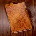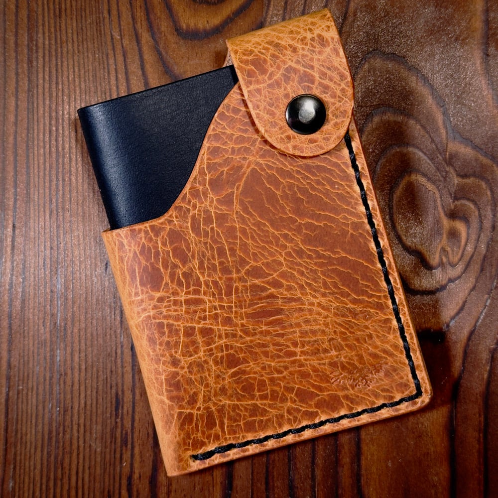 Minimalist wallet designed to hold approximately 7 cards and cash in the back snap portion. The outside shell is bone Badalassi Carlo pull-up and the inside is black Badalassi Carlo Vacchetta.